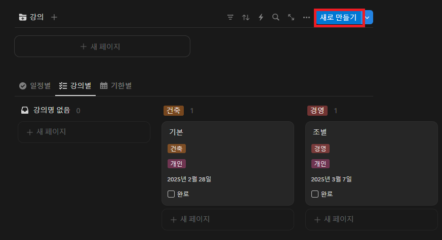 - [강의] 항목에서 [새로 만들기]를 통해 새로운 강의를 생성할 수 있습니다.