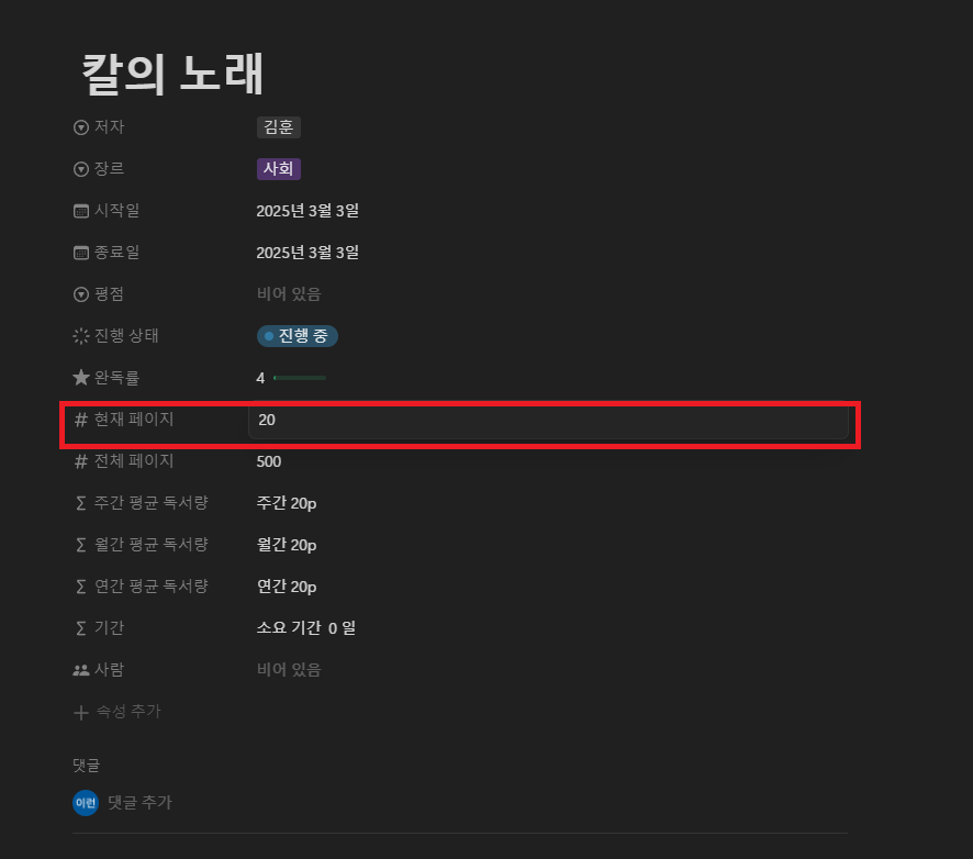 - [저자], [장르], [시작일], [종료일], [진행 상태], [현재 페이지], [전체 페이지]를 입력합니다.