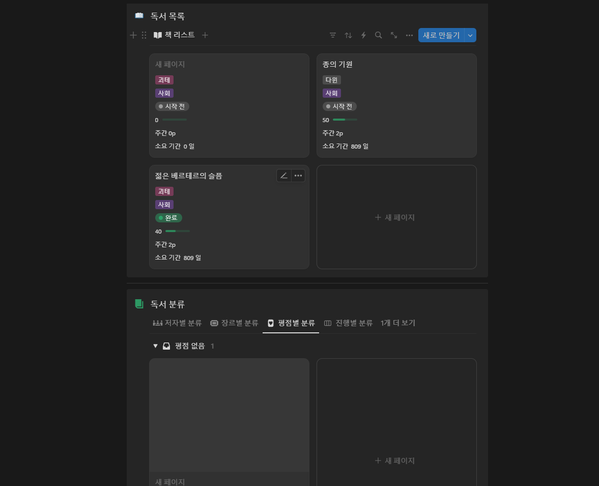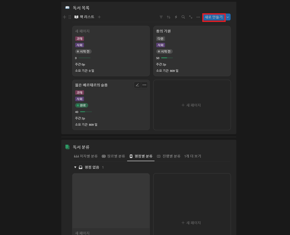 - [독서 목록] 블럭에서 [새로 만들기]를 클릭합니다.
