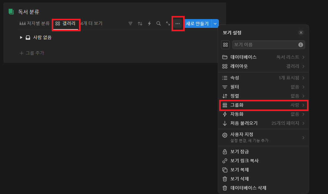 - [독서 분류] 블럭의 […]을 클릭하여 [그룹화]를 [사람]으로 설정합니다.