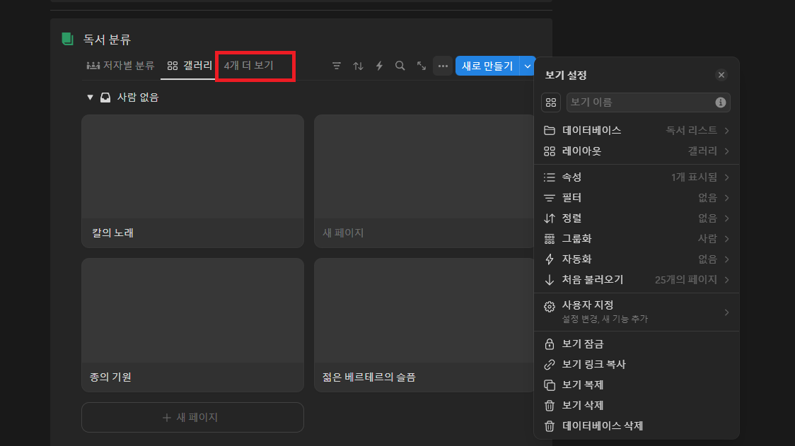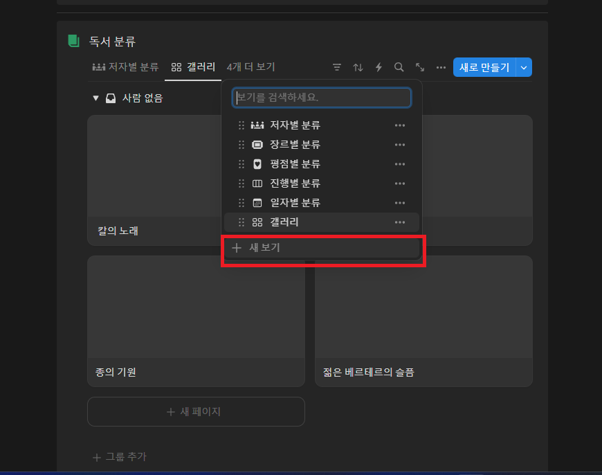 - [독서 목록] 블럭의 [새로 만들기] 우측 [▽]을 클릭합니다.
