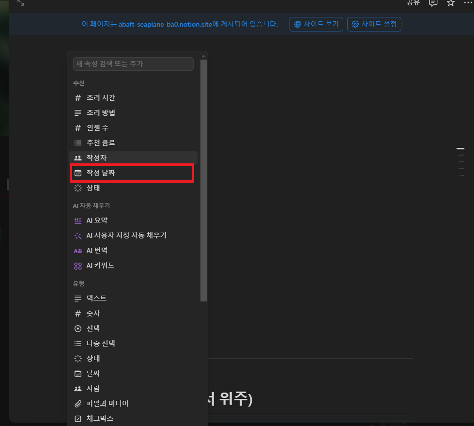 - 속성 목록에서 [날짜 속성]을 선택하고 이름을 [요리 날짜]로 변경합니다.