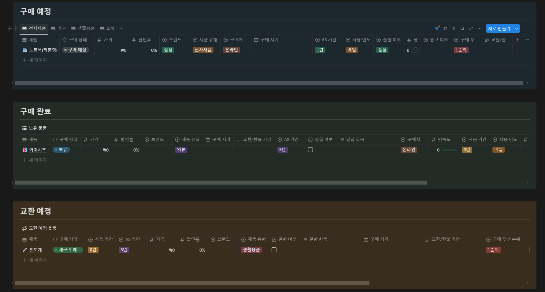 - 구매 상태: 구매 예정, 보유, 재구매 예정 등 제품의 상태를 구분합니다.