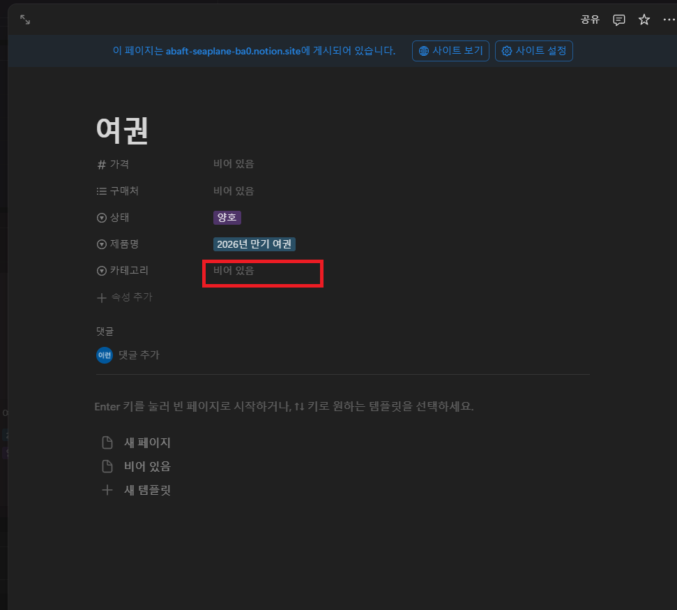- 제목인 [새 페이지]를 클릭하고 [여권] 입력