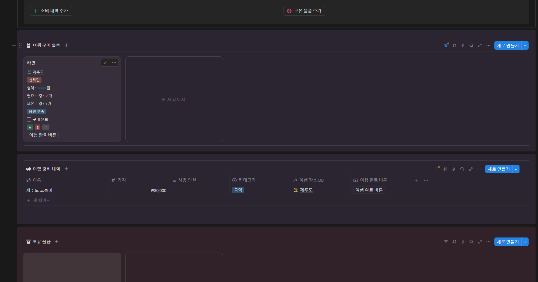 - 여행 완료 버튼: 여행이 끝난 뒤 버튼을 누르면 해당 항목들이 자동으로 사라집니다.