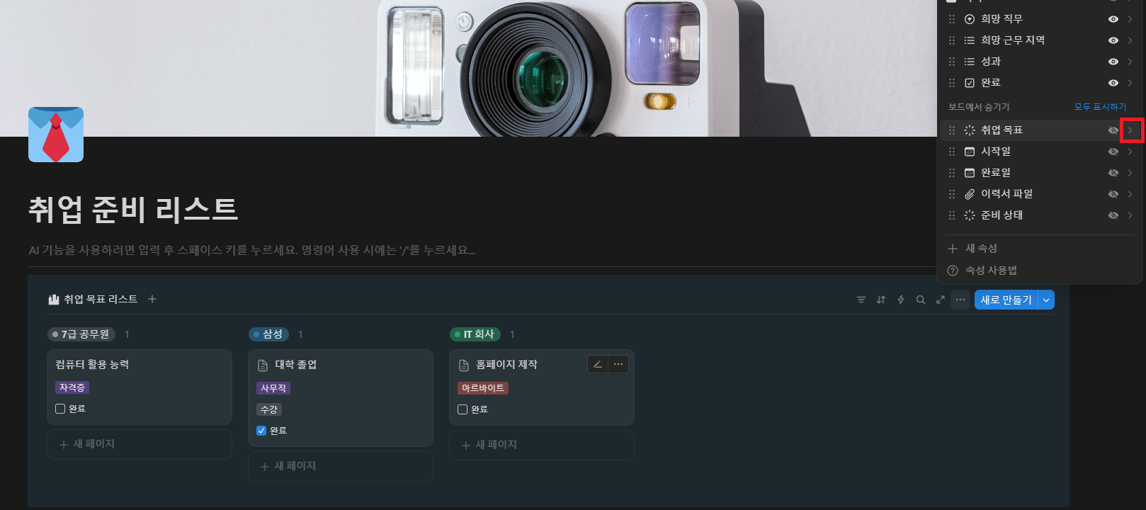• [속성]을 클릭하고 [취업 목표] 우측 [▷] 클릭
