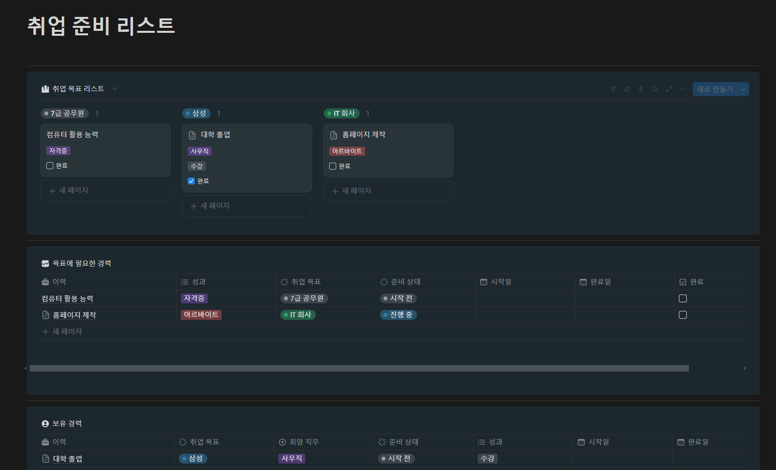 노션 취업 준비 리스트는 취업 목표 설정, 필요한 역량 관리, 보유 역량 정리, 준비 상태 등을 확인할 수 있습니다.