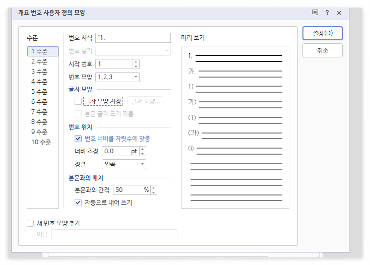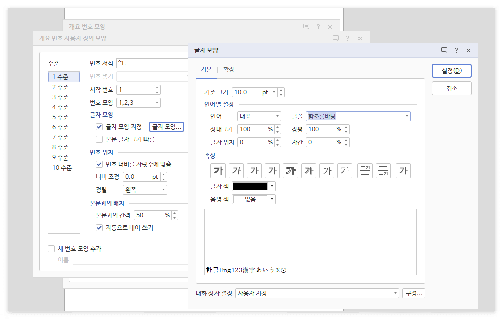 • [Ctrl+K, O(개요 번호 모양)] → [사용자 정의 모양] → [글자 모양 지정]에서 개요의 스타일(검은 글자 색상)을 설정합니다. 개요의 색상이 본문의 글자 색상과 독립됩니다.