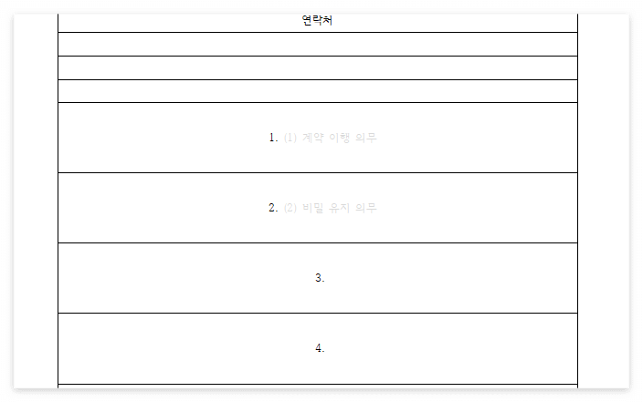 • 개요마다 작성자를 위한 가이드라인을(: 비밀 유지, 계약 이행 등의 조항) 엷은 색상의 글씨로 작성합니다.