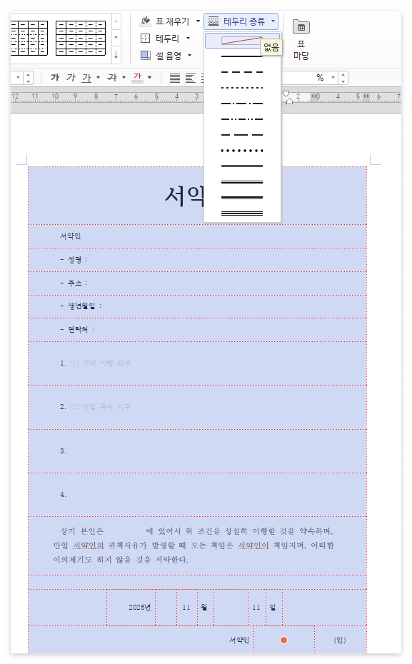 • [테두리 종류] → [없음] 설정으로 문서의 안정성과 가시성을 확보합니다.