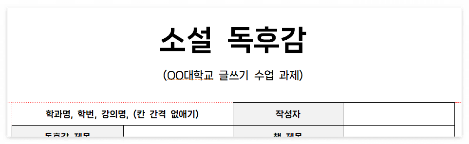 - 부제 추가 : [소설 독후감]에 커서를 두고 [Enter]로 문단 구분 → 제목 하단에 (OO대학교 글쓰기 수업 과제) 입력