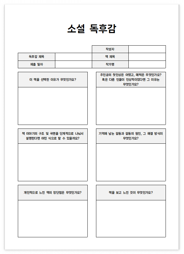 소설 독후감 양식은 책의 내용을 체계적으로 정리할 수 있습니다. 대학 독후감 작성에 도움이 되길 바라며, 수정 방법이나 사용법에 관한 추가 문의는 댓글로 남겨주세요.