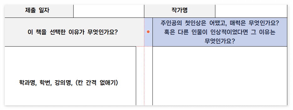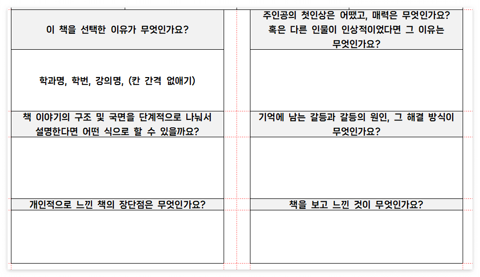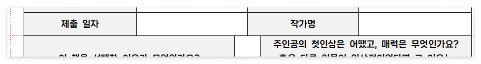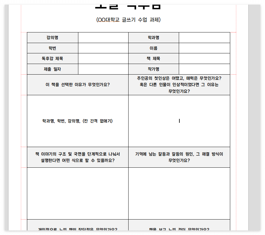 아래 이미지는 이번에 배포하는 소설 독후감 양식의 미리보기 화면입니다. 이 독후감 양식은 논픽션 독후감이 아닌 소설 독후감 양식입니다. 논픽션 독후감 양식은 간단한 수정만 거치면 얻어낼 수 있습니다. 혹은 나중에 추가로 업로드하도록 하겠습니다.